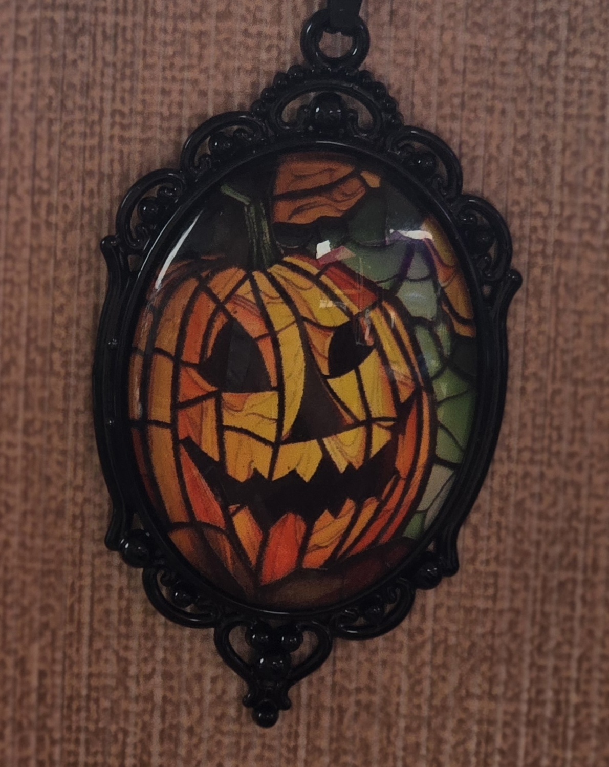 These Halloween-themed necklaces feature ornate black frames surrounding vibrant cabochon pendants designed in a stained-glass style. Each piece showcases a different seasonal motif—such as glowing jack-o’-lanterns, swirling autumn leaves, or eerie bats against a moonlit sky—capturing both the spooky and whimsical sides of the holiday. While individual designs may vary, every necklace in the assortment offers a striking blend of gothic elegance and festive charm, making them perfect for adding a touch of Halloween magic to your outfit or gifting to a fellow Halloween lover.